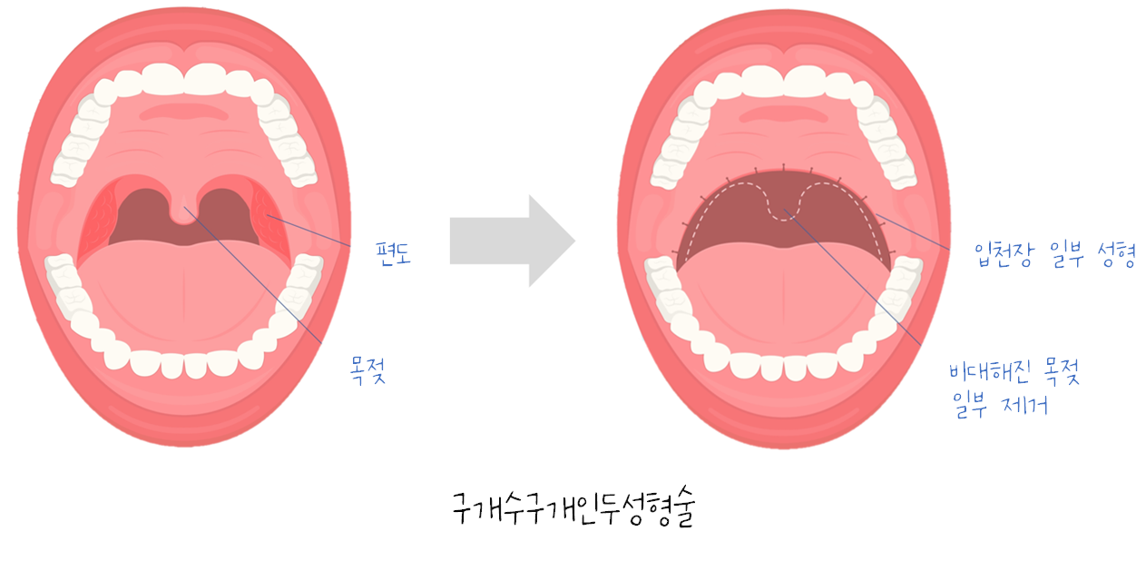 - 수술 방법 : 목젖 양쪽에 위치한 구개 편도를 제거하고✂ 비대한 목젖, 입천장 일부를 제거하여✂ 기도의 면적을 넓히는 수술